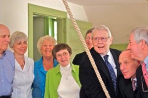 In this photo, Dan Wolf, second from the right, Chairman of the Board of Directors, leads the Board in the first official ringing of the Meeting House’s renovated bell. Dan is joined by (from left) Bill Weiler, head of the Architectural and Restoration Committee; Linda Plunket, Board member; Claire Vannatta, Treasurer; Barbara Steward, head of the Membership Committee; Joy Nowell, Board member; Chuck Kennedy, Vice Chairman; Dan and Senator Bob Odell.